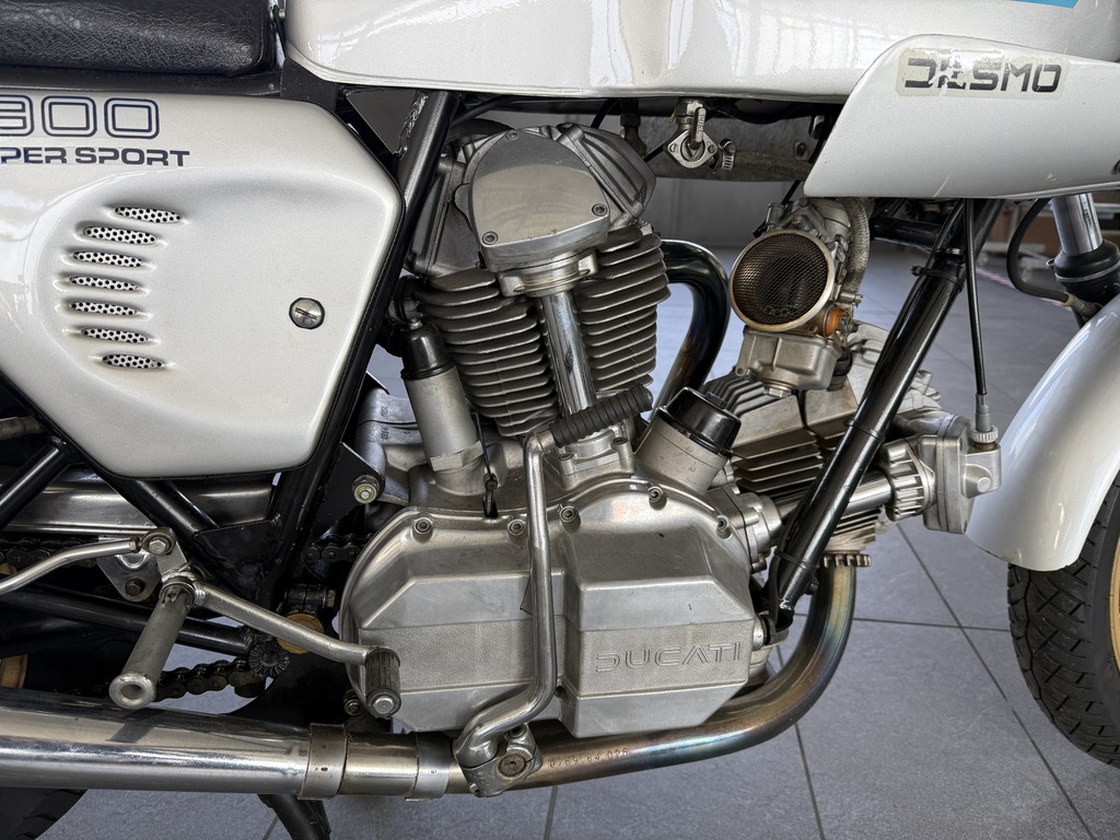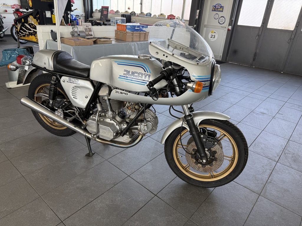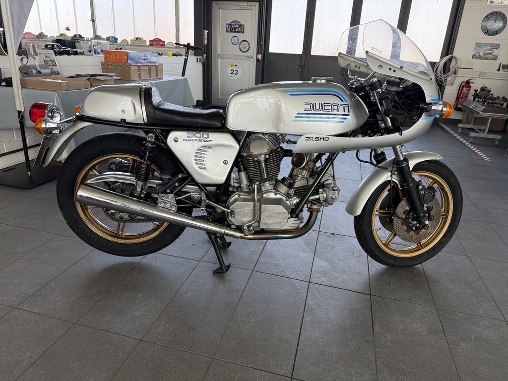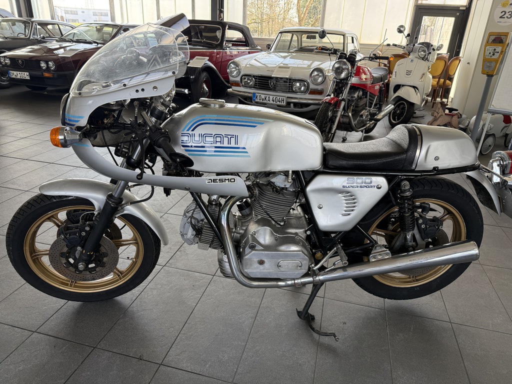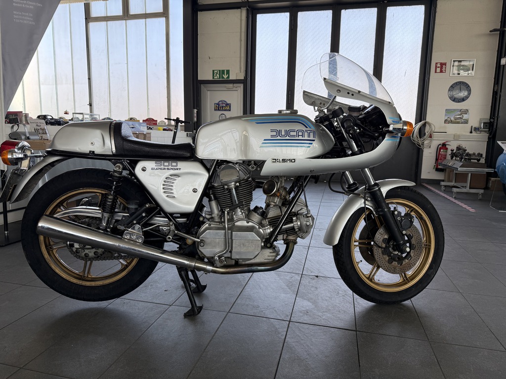 steht eine außergewöhnlich schöne Ducati 900 SS Königswelle aus dem Jahr 1981 – eine echte Ikone italienischer Motorradbaukunst und heute ein begehrtes Sammlerstück mit hoher