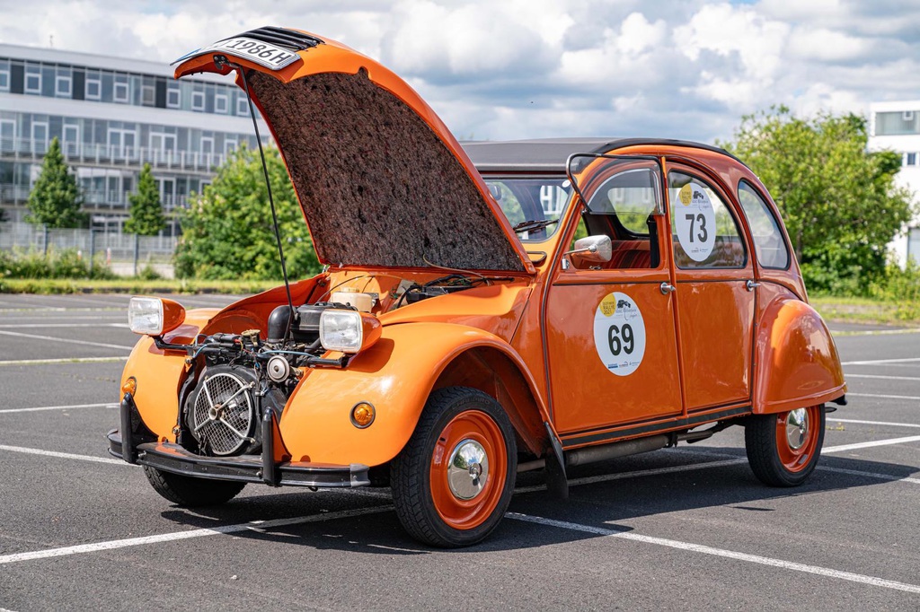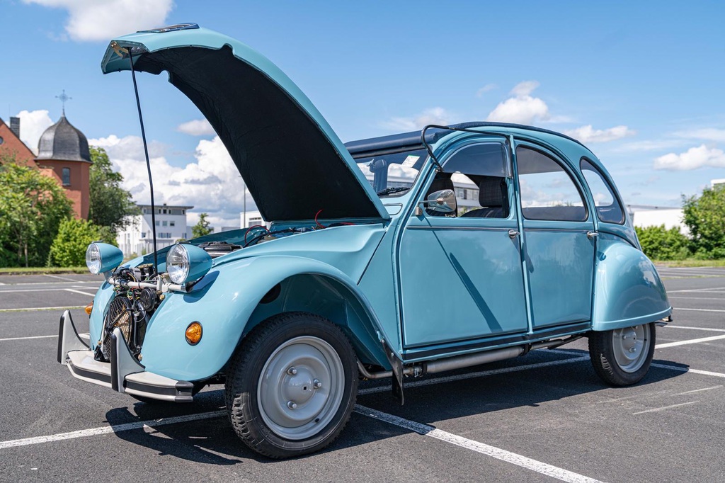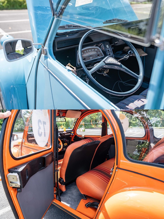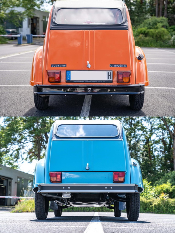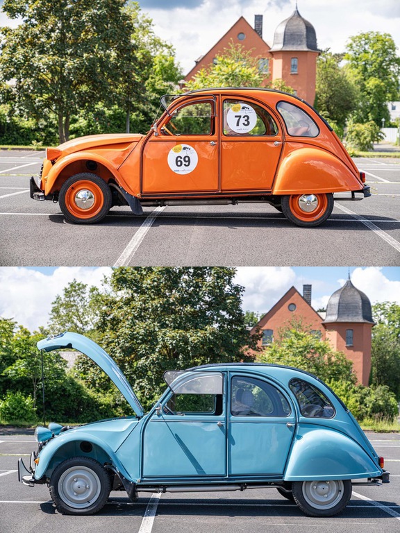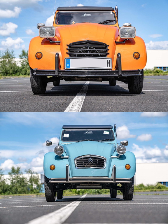 Hier haben wir das französische Lebensgefühl direkt im Doppelpack: Einmal Ente à l' Orange und einmal Ente Himmelblau. Beide Enten sind Frame Off restauriert. Alles wie neu. Beide vom gleichen Fachmann hier im Haus komplett zerlegt, alles repariert und neu lackiert und wieder mit viel Liebe und Akribie zusammengefügt. Man kann sagen, besser als aus dem Werk. Alle Roststellen beseitigt, alles geschweißt und versiegelt, alles überholt. Fahren, Bremsen, Schalten, wie es sein soll. Also sichern Sie sich eine der beiden Enten..... oder Beide?