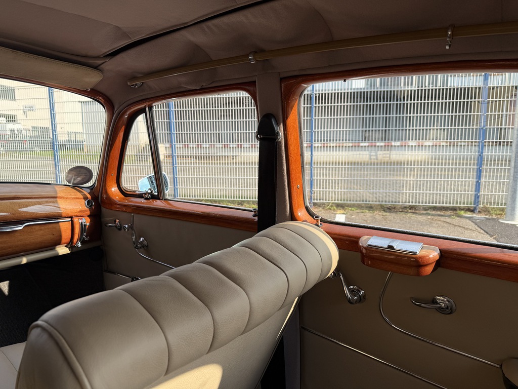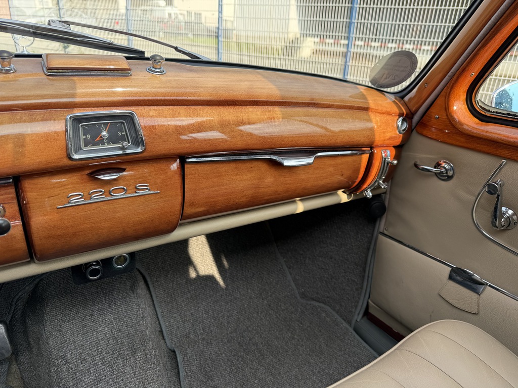 Neben seinem überzeugend ruhig laufenden Motor besticht der 220 S mit seiner gehobenen Innenausstattung, die neben diversen zeitgemäßen Details eine wunderschöne Holzausstattung bietet. Der hier angebotene Ponton gelangte 1957 in der Erstauslieferung nach Frankreich und fand später den Weg zurück nach Deutschland, wo er einer umfassenden Restaurierung unterzogen wurde, sodass neben der Karosserie auch der Innenraum sich bestens präsentiert. Die Holzausstattung glänzt neben neuer Innenausstattung. Als Schmankerl besitzt der 220 S eine CD-Anlage mit Zusatzlautsprecher, natürlich entsprechend versteckt. Sicherlich eine Besonderheit stellt das Originalfaltschiebedach dar, dass das Fahrzeug fast zu einem Cabrioflair bei vollständiger Öffnung verhilft.